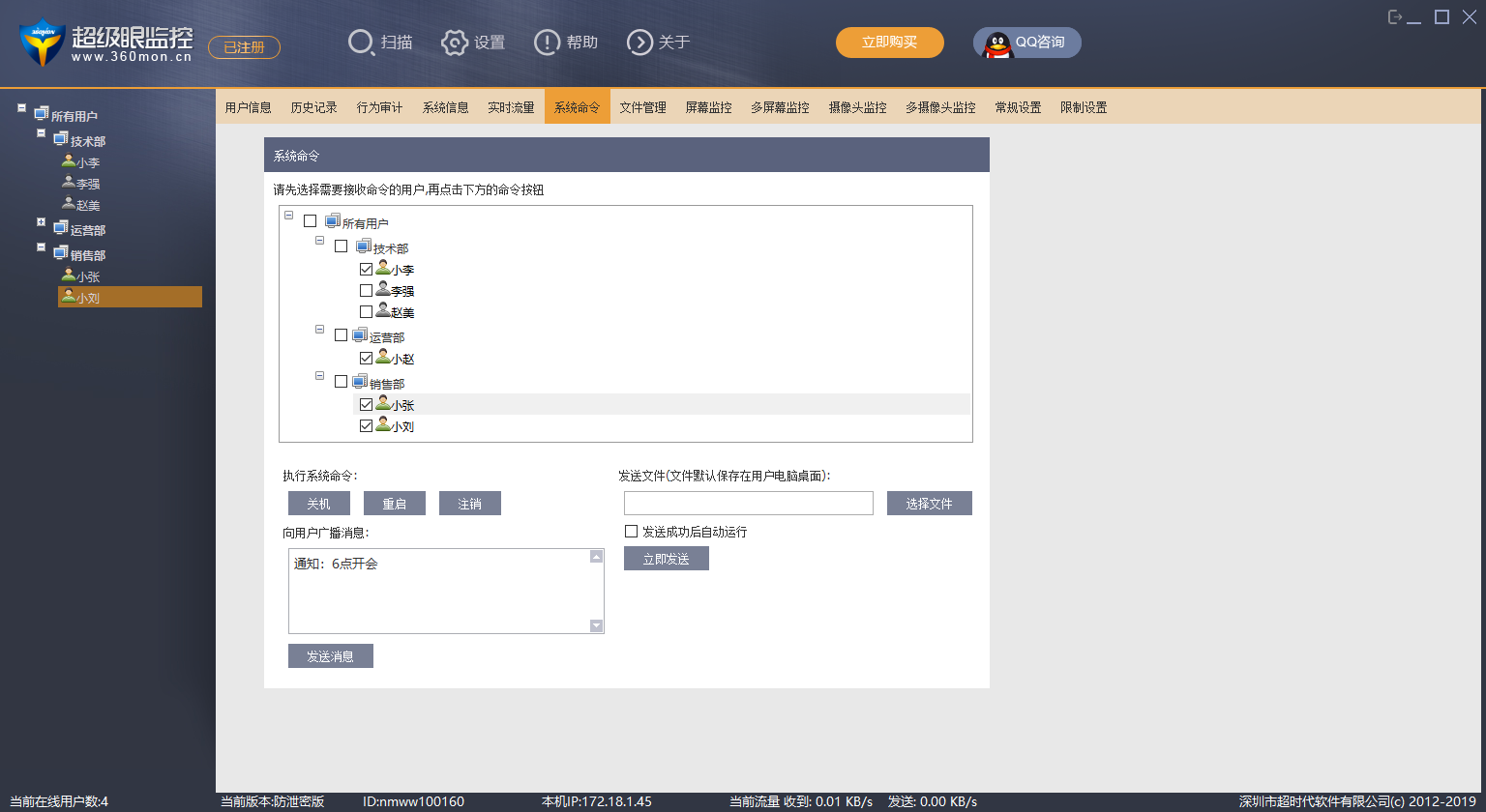 6、批量管理电脑:电脑监控软件可以同时关闭、重启或取消多台计算机,便于公司计算机的统一管理。