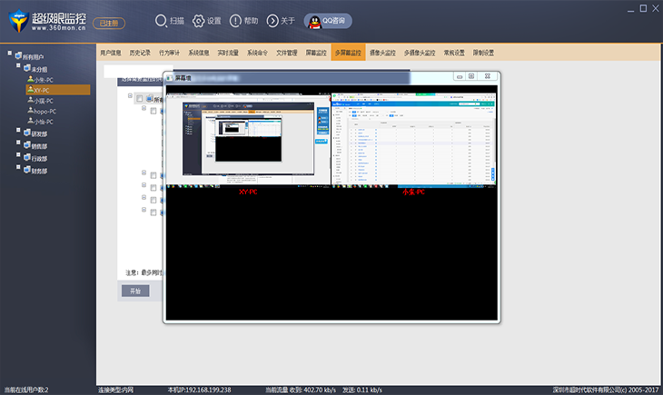 1.实时监视:对员工电脑屏幕进行实时监视,就象看自己的电脑屏幕。我们还提供了多画面监视功能,让您可同时最多监视16个员工的电脑屏幕,就象看电视墙那样。
