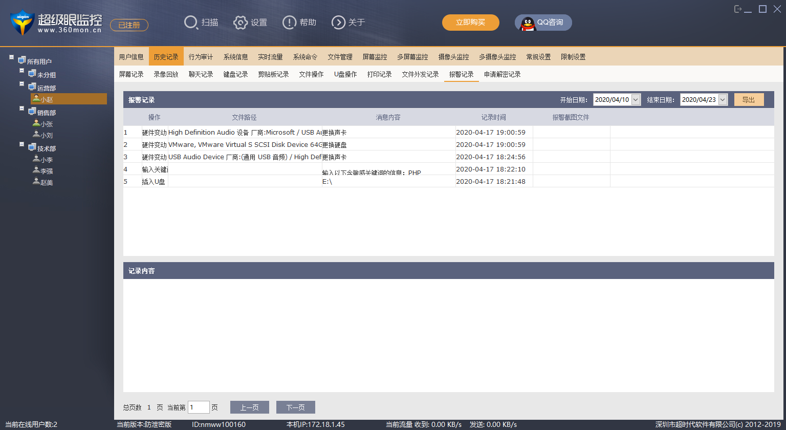 5、文件操作监控:能记录员工复制了哪些文件到优盘或者其它路径、粘贴,删除了哪些文件,什么时间插入拔下优盘所有记录一条不少全部记录到服务器数据库,可以随时查询。