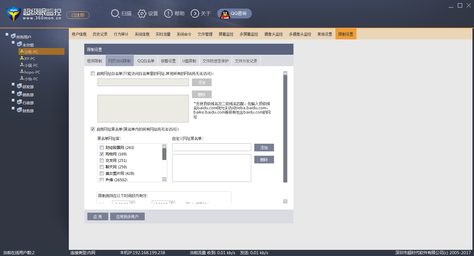 通过网页浏览限制可以轻松规定员工只能上哪些网站,也可以规定员工不能上哪些网站。网站白名单允许员工只能上哪些网站(除白名单中的网站外,其他任何网站均不能访问);网站黑名单功能屏蔽与员工工作无关的网站,比如购物网站、游戏网站、视频网站、色情网站等,不影响没有被禁止的网站的访问;满足企业管理者对员工浏览网页的需求。